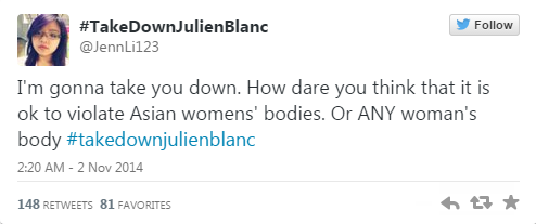 Ontem, Jenn publicou um artigo no importante jornal britânico The Independent: "Julien Blanc é um predador sexual racista ensinando homens a rapinar mulheres como eu -- e ele deve ser impedido. É inacreditável que, por tanto tempo, homens como Blanc não sejam punidos por seu comportamento vil, e até são recompensados". Não preciso nem dizer que Jenn tem recebido várias ameaças de morte e estupro, além de incontáveis ofensas.